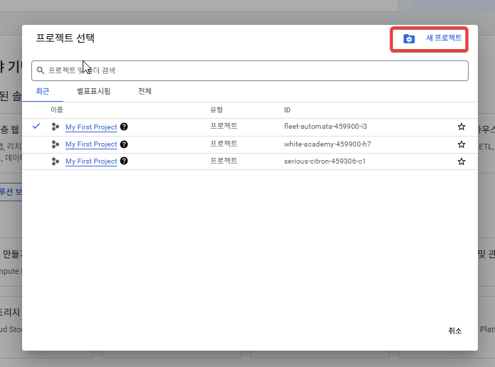 이미지와 같이 "프로젝트 선택" 팝업 창이 나타나면 우측 상단의 "새 프로젝트" 버튼을 클릭합니다.