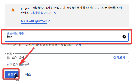 이미지와 같이 새 프로젝트 이름을 설정하는 화면이 나타납니다. *빨간색 박스로 강조 표시된 "프로젝트 이름 " 필드에 원하는 프로젝트 이름을 입력합니다. 여기서는 "free"라고 입력했습니다. "위치 *" 필드는 기본 설정("조직 없음")으로 두고, 화면 좌측 하단의 빨간색 박스로 강조 표시된 "만들기" 버튼을 클릭합니다.
