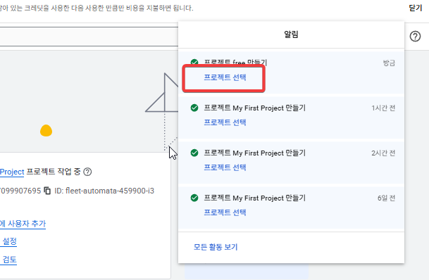 새 프로젝트가 성공적으로 생성되면 이미지와 같이 알림 창에 "프로젝트 free 만들기" 알림이 표시됩니다. 프로젝트 선택 클릭합니다.