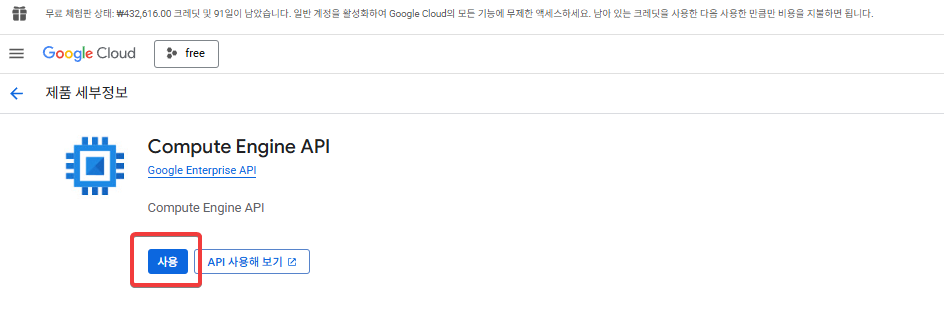 VM 인스턴스를 처음 생성하는 경우 Compute Engine API를 활성화해야 할 수 있습니다. 이미지와 같이 "Compute Engine API" 화면이 나타나면 "사용" 버튼을 클릭하여 API를 활성화합니다. (이미 활성화되어 있다면 이 단계는 건너뛸 수 있습니다.)