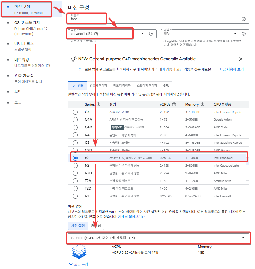 - 머신 구성: "머신 시리즈"에서 "E2"를 선택하고, "머신 유형"에서 "e2-micro (vCPU 0.25~2개, 메모리 1GB)"를 선택합니다. 이는 무료 등급에서 사용할 수 있는 VM 사양입니다.