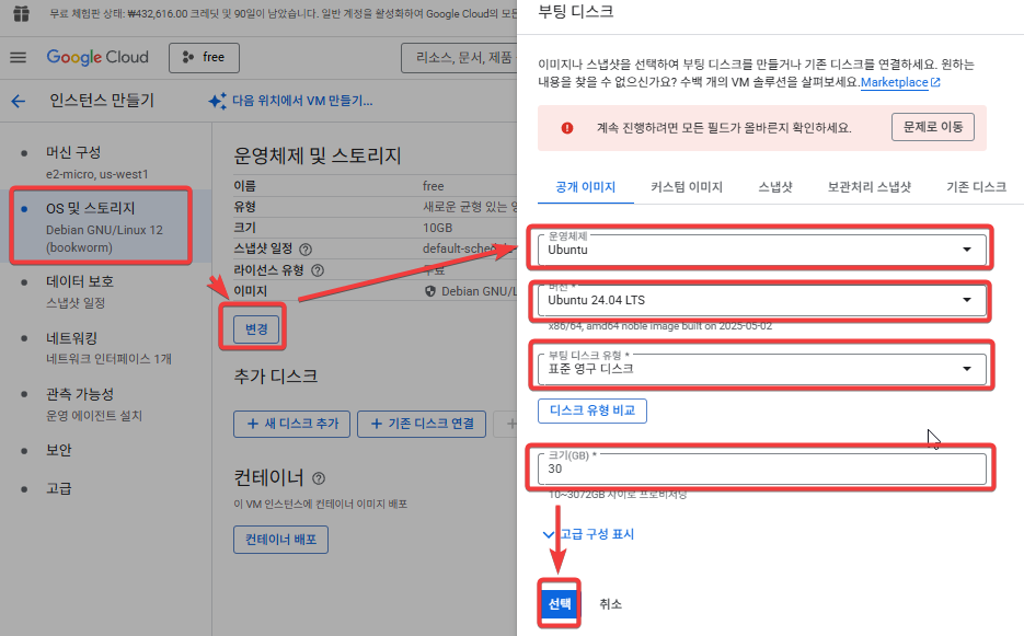 - 버전: 드롭다운 메뉴에서 "Ubuntu 24.04 LTS"를 선택합니다.