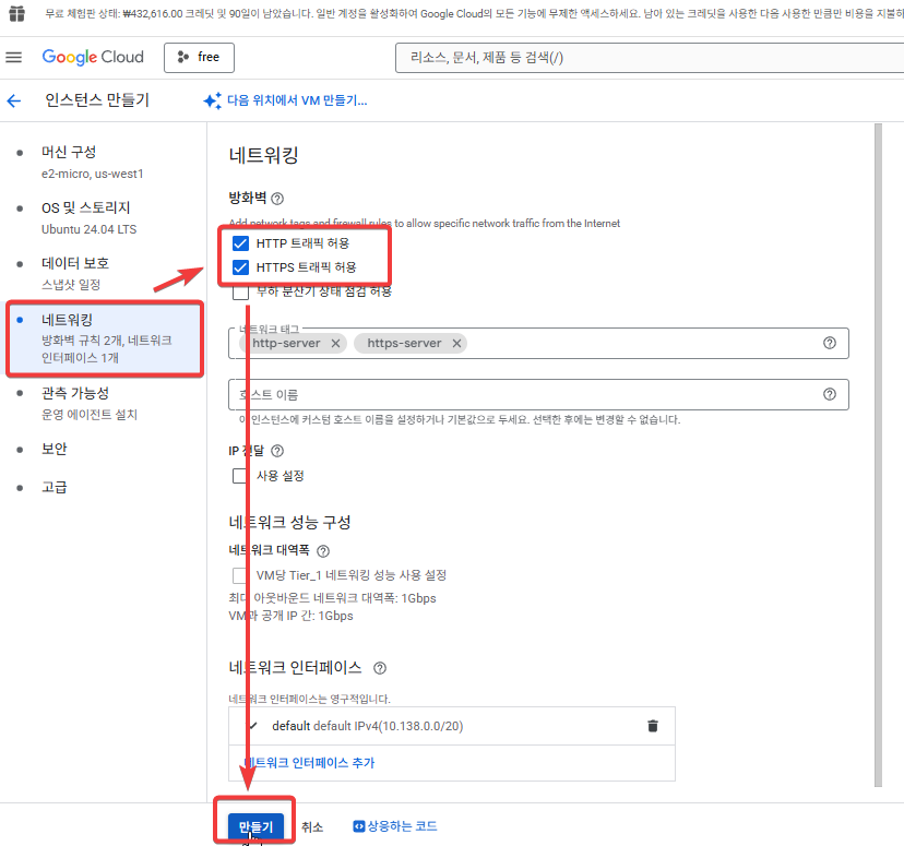 화면 좌측의 "네트워킹" 메뉴를 클릭합니다. "방화벽" 섹션에서 외부에서 웹 서버에 접근할 수 있도록 "HTTP 트래픽 허용"과 "HTTPS 트래픽 허용" 체크박스를 모두 선택합니다. 그리고 만들기를 클릭합니다.