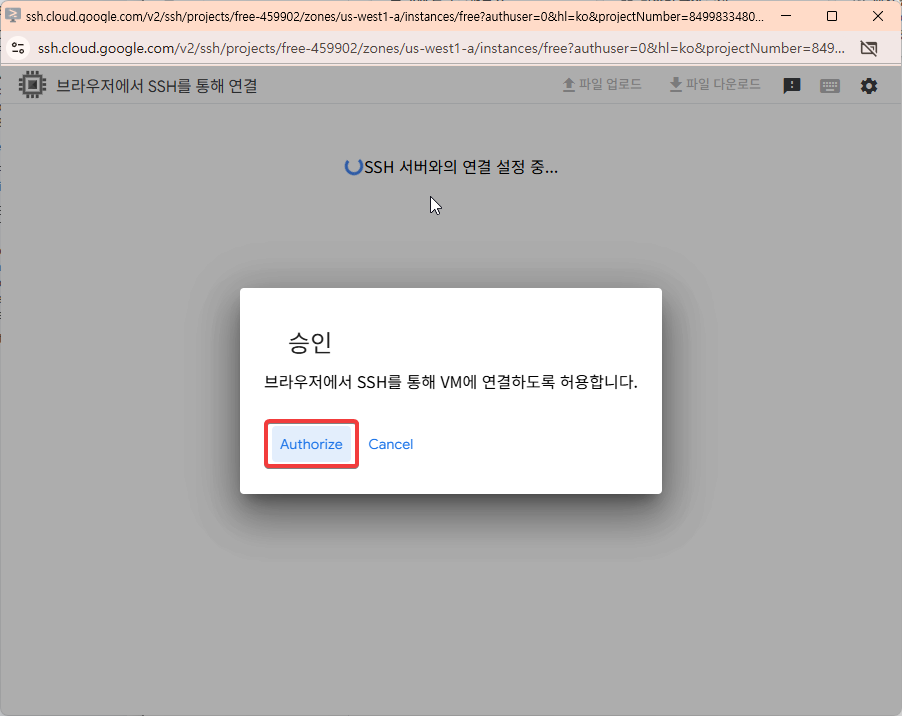 이미지와 같이 "브라우저에서 SSH를 통해 연결" 화면이 나타나고, 연결을 승인하는 팝업 창이 표시됩니다. "Authorize" (승인) 버튼을 클릭합니다.