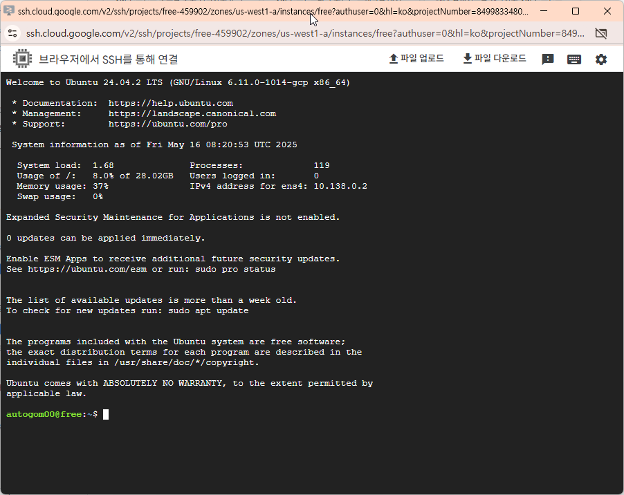 이미지와 같이 브라우저 기반 SSH 터미널이 열리고, Ubuntu 서버의 명령 프롬프트를 확인할 수 있습니다. 이제 웹 브라우저를 통해 VM 인스턴스에 명령어를 입력하고 관리할 수 있습니다.